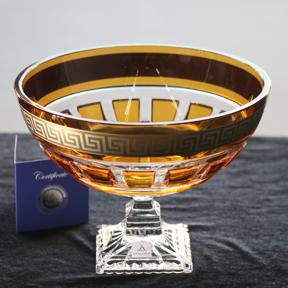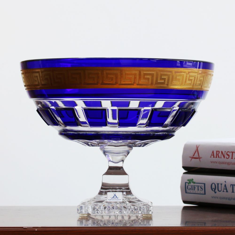 Trên miệng đĩa, vòng vàng được vẽ tay với hoa văn Hy Lạp cổ điển, biểu tượng cho sự vĩnh hằng và trường tồn, khiến tác phẩm trở nên sống động và giàu giá trị nghệ thuật. Phần chân đế chắc chắn nâng đỡ thân đĩa loe rộng, cân bằng hoàn hảo giữa sự uyển chuyển và vững chãi. Khi ánh sáng chiếu rọi, những khối vát trên thân đĩa phản chiếu lung linh, tạo nên một bức tranh ánh sáng ấm áp và huyền bí. Đây không chỉ là một chiếc đĩa pha lê, mà là vầng hào quang sang trọng tô điểm cho mọi không gian cao cấp, từ phòng khách biệt thự cho đến sảnh tiếp khách ngoại giao.
