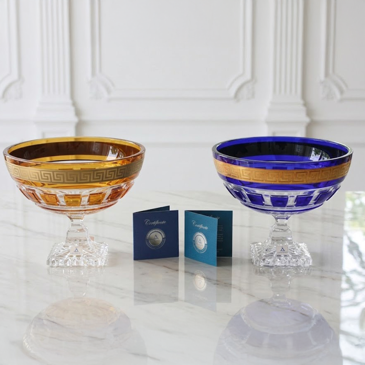 Trải qua nhiều công đoạn phức tạp, đôi tay điêu luyện của các nghệ nhân đã tạo nên hình khối cân đối, vững chãi mà tinh tế. Đỉnh cao chính là bước vẽ vàng 24K thủ công – từng chi tiết hoa văn Hy Lạp được vẽ tay tỉ mỉ, sau đó nung nhiều lần để lớp vàng bám chắc, sáng bóng trường tồn. Toàn bộ quá trình ấy không chỉ là kỹ thuật chế tác, mà còn là nghệ thuật thổi hồn vào pha lê, biến chiếc đĩa trở thành một tác phẩm nghệ thuật mang giá trị hoàng gia.