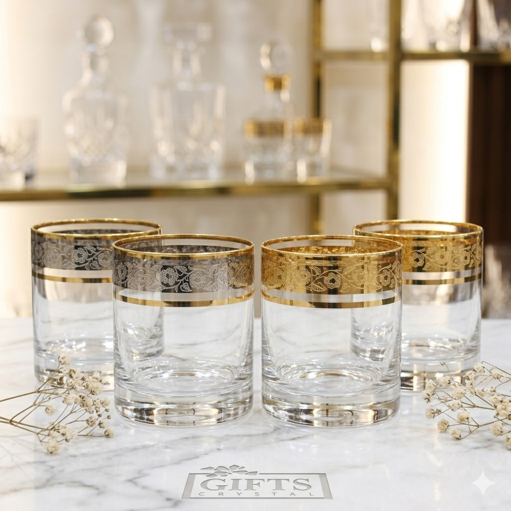Điểm đặc trưng của dòng ly Favorit nằm ở phần viền mạ vàng bản lớn chạy quanh miệng ly. Đây là chi tiết tạo nên vẻ sang trọng cho chiếc ly, đặc biệt khi rót rượu whiskey vào, màu rượu vàng hổ phách kết hợp với viền vàng tạo nên tổng thể rất đẹp và ấm. Khi đặt ly dưới ánh đèn vàng hoặc trong không gian nội thất gỗ, ly sẽ nổi bật và tạo cảm giác rất cao cấp.