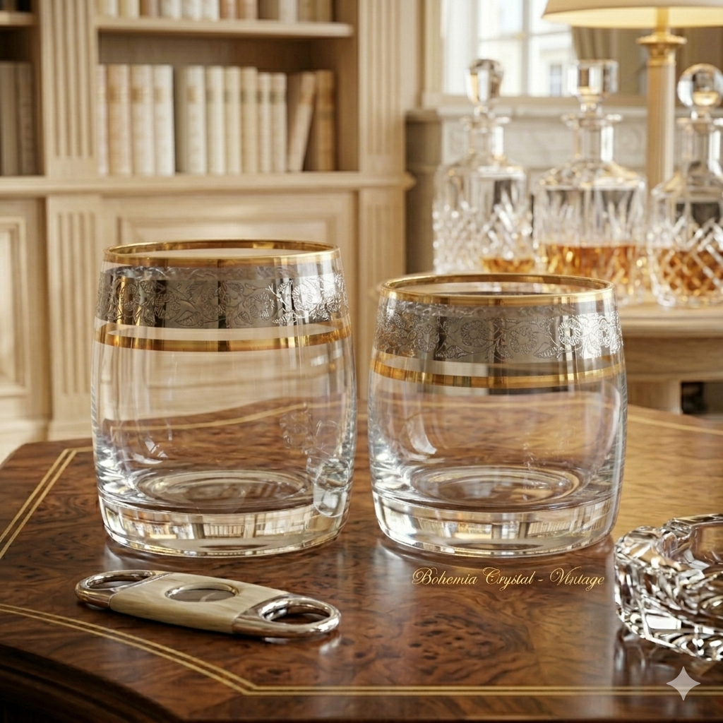 Ly rượu Whiskey Ideal MV của Crystal Bohemia là dòng ly uống rượu mạnh mang phong cách cổ điển châu Âu, nổi bật với thiết kế thân ly tròn, đáy dày và viền mạ vàng trang trí hoa văn tinh xảo. Đây là kiểu ly thường thấy trong các bộ ly rượu mạnh cao cấp, phù hợp sử dụng trong phòng khách, phòng làm việc, phòng cigar hoặc những không gian mang phong cách sang trọng và cổ điển.